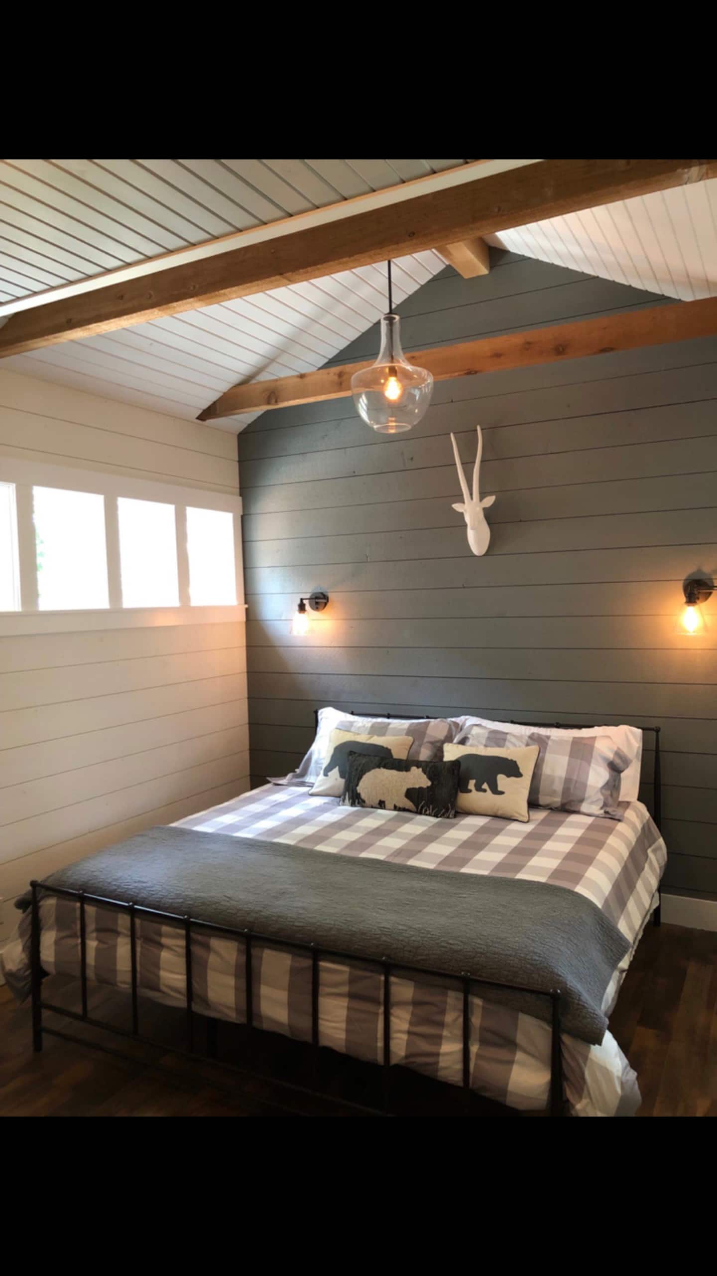 But what’s inside is as stunning as the exterior. As you open the door to your New Buffalo oasis, you’ll be greeted with artistically distressed floors and exposed cedar beams. White wood paneling covers almost every surface, lending the place a cabin feel. Going from room to room, you’ll find ample space for the whole family. This includes not only large plush beds in the master bedrooms but also camping-style bunk beds for the little ones.